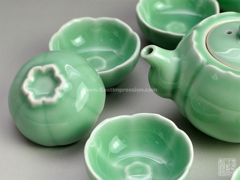 该款茶具以“莲”为设计的核心,茶壶、茶杯均以六瓣莲瓣纹巧饰,壶口、杯口均为起伏优美的莲花口,宛若一朵朵含苞欲放的青莲。壶底、杯底以未施釉的六瓣莲花成型,在细节处体现巧思。其胎质缜密坚硬,梅子青釉釉层肥厚,釉色青翠莹润,犹如嫩荷涵露,永存记忆深处。