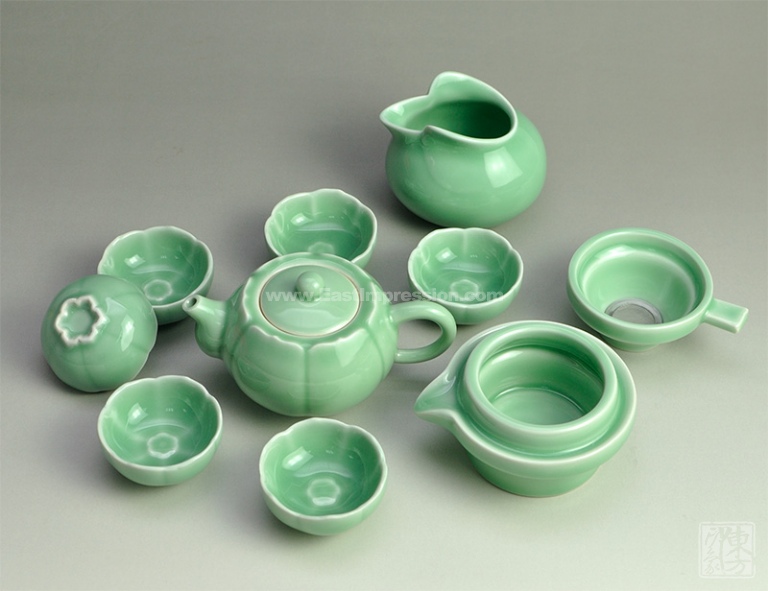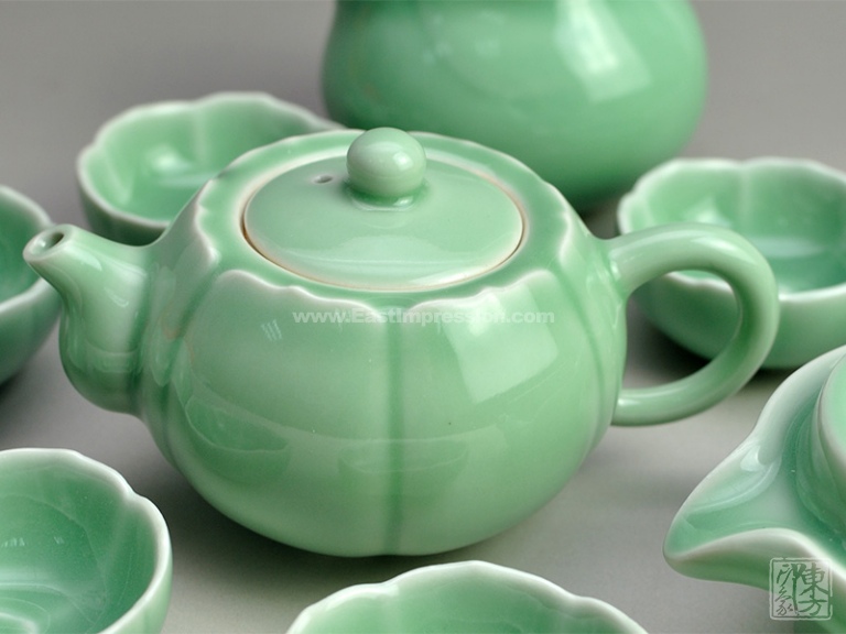 该套茶具精选龙泉本地优质瓷土,采用龙泉青瓷传统烧制技艺﹙高温氧化还原﹚制成。
