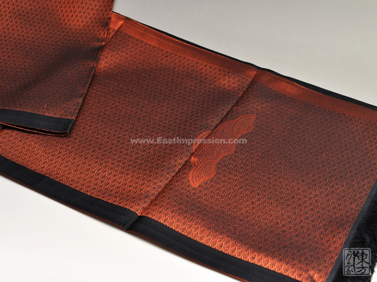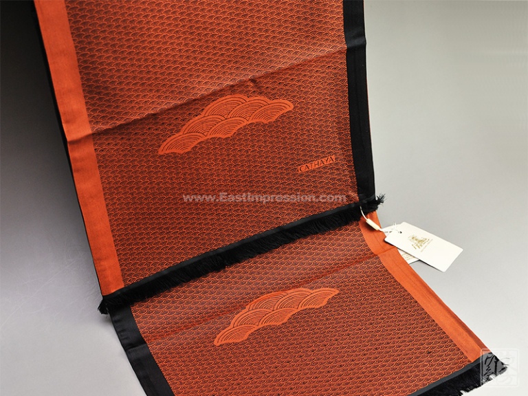 该款长巾以充满韵律之美的“水波纹”通体铺陈,以形似意同的“江崖海水纹”对称式呈现,融汇了青云得路、福禄随身的美好祝愿。两侧边沿以赭石与黑色带装饰,使纹饰与色调在统一中又赋予变化。细密的黑色短流苏设计,细节处彰显匠心。整体具有成熟稳重之风。