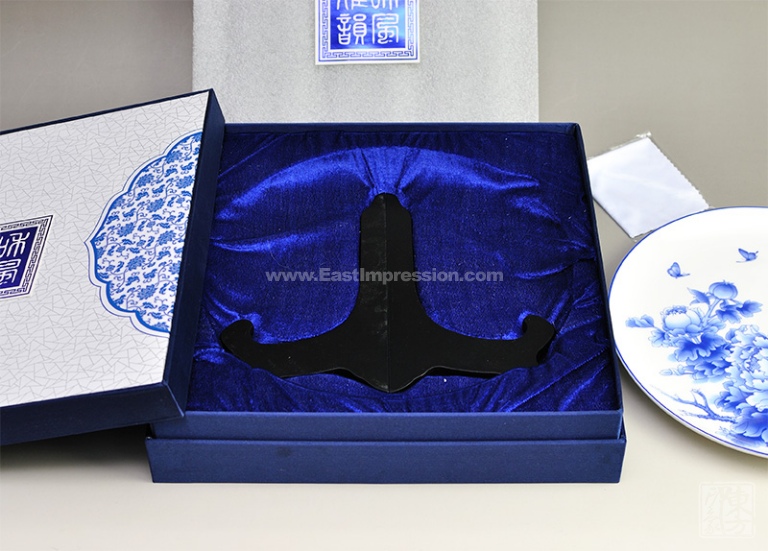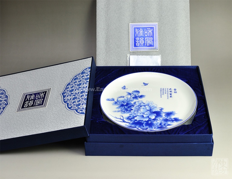 该款赏盘的瓷质为唐山一级骨质瓷(骨粉含量45%),是以动物的骨炭、粘土、长石和石英为基本原料,经过高温素烧和低温釉烧两次烧制而成。青花牡丹的花面是采用釉上彩的装饰技艺,即用颜料制成花纸贴在釉面上,再入窑经摄氏700度至900度烘烤而成。