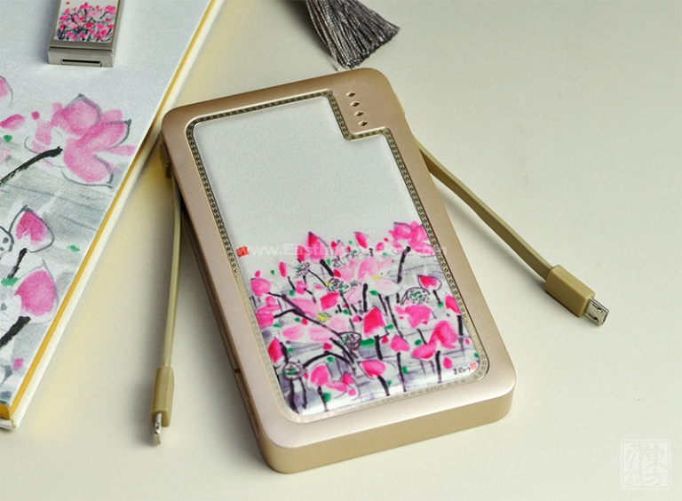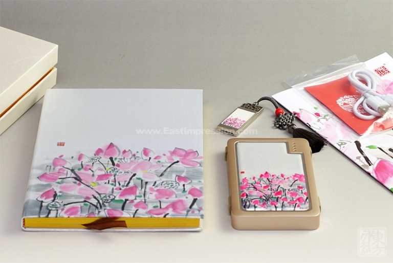 该款套装创造性地将中国最具特色的丝绸与时尚前沿的电子产品相结合,丝绸质地的柔美华贵、香槟金色泽的典雅柔和,加之铂金镶边工艺的低调奢华,让产品在实用的基础上更具欣赏价值。以吴冠中先生的《荷花》统一形象,浓墨重彩的玫红色花朵扑面而来,其间大块小块叶片之交错,根茎曲线直线穿插之繁杂,莲蓬点缀其中,连淡墨倒影也被包围进叶丛中,似乎误入了花叶的迷宫,其景其境令人迷恋。