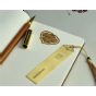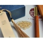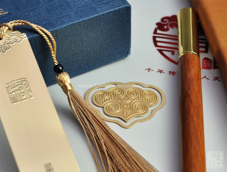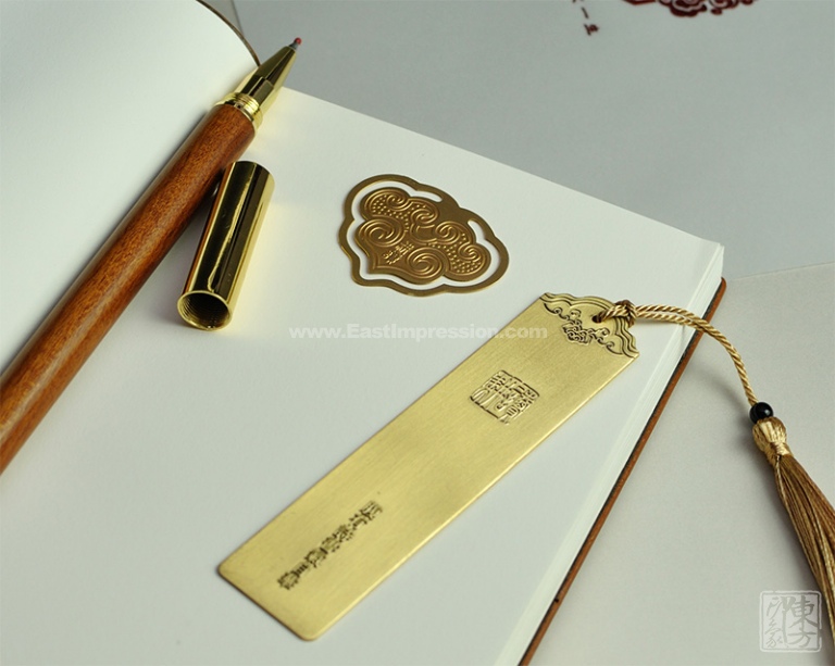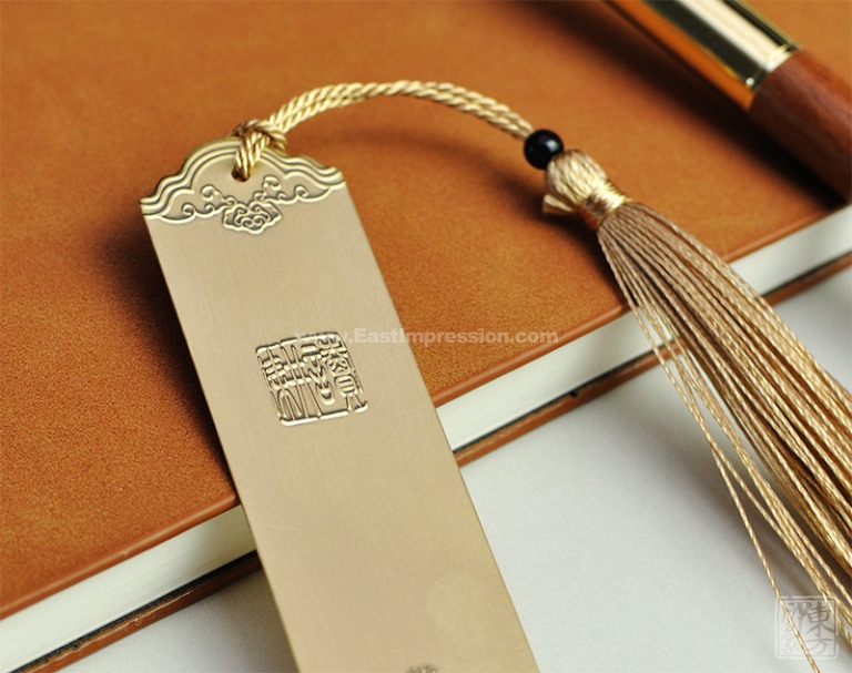 书签选用上等纯黄铜,靓而不艳,手工打磨,厚薄适中。顶部边缘的弧度与水波、如意的纹饰是雨巷的飞檐,与“耕读”、“腹有诗书气自华”浅浮雕般呈现。