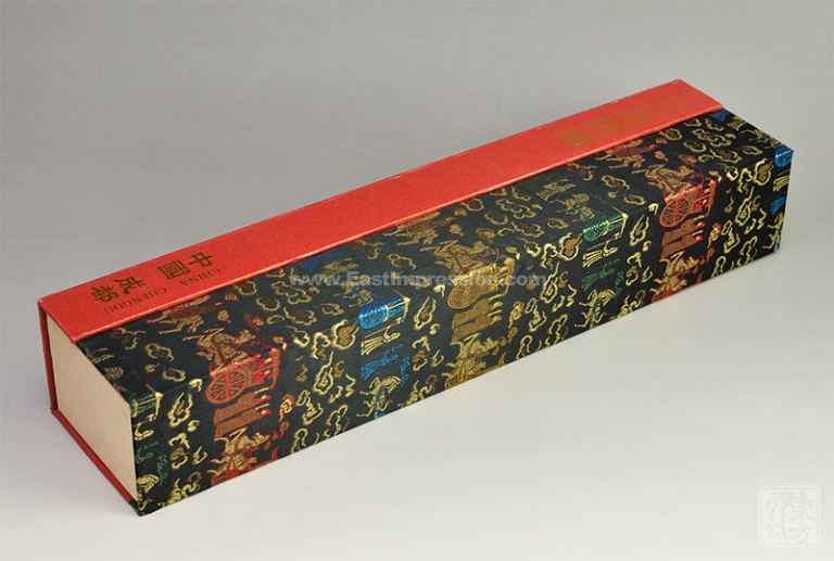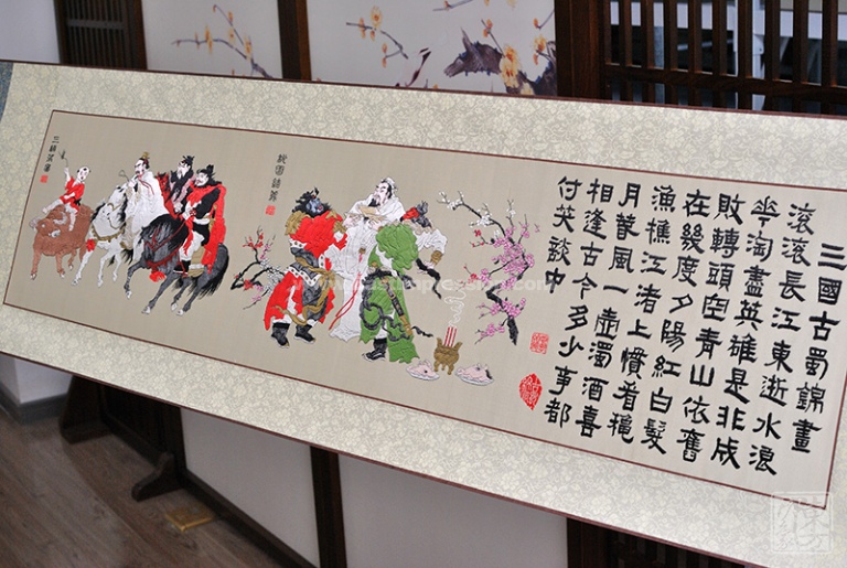 蜀锦享有“中国四大名锦之首”的美誉,已被列入第一批国家级非物质文化遗产名录。古蜀锦是原汁原味的蜀锦,是经过繁复的工艺全程手工织出的蜀锦,产品开发周期长、产量和品种非常有限,但作品精美绝伦,且很少面市,极具收藏价值。此款长卷以“桃园结义”、“三顾茅庐”为题材,选材精巧,将蜀地的历史人物故事与千年蜀锦的独特工艺巧妙地融合在一起。