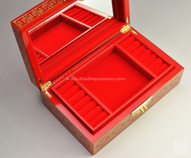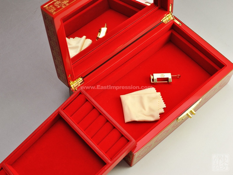 首饰盒内部双层结构,盒盖内镶嵌玻璃镜。内盒采用植绒装饰。锁扣、铰链、小锁均为纯铜雕花。