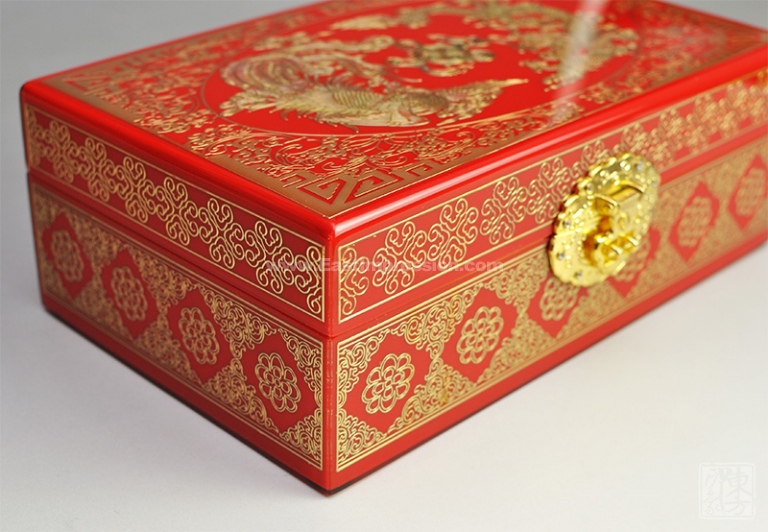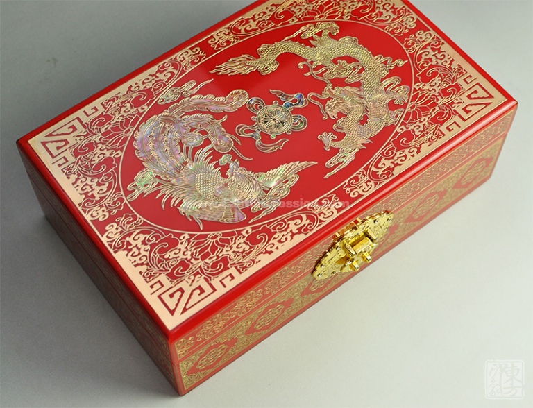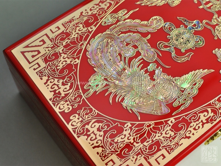 天水漆器掐铜丝嵌螺钿高档首饰盒:凤戏牡丹图(红)