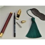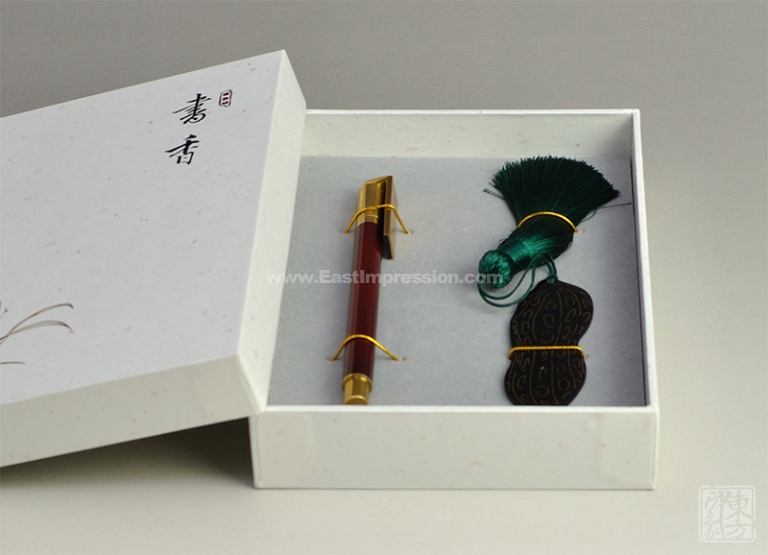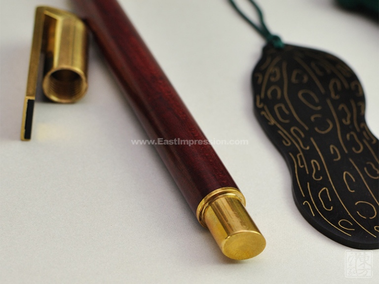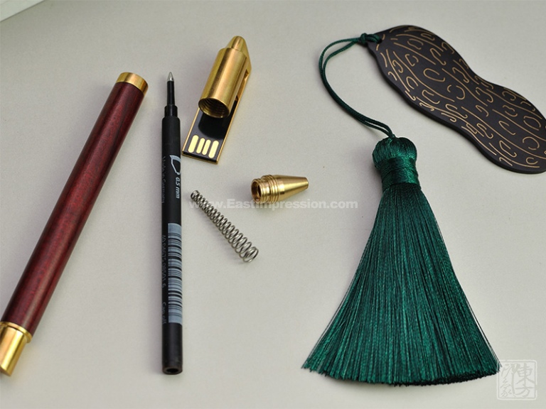 将u盘巧妙嵌入笔夹的设计,是U盘笔的亮点,随身携带精巧便利且不易丢失。科檀鲜妍夺目,紫光檀深沉静穆,黄铜亮丽雅致,流苏的墨绿浓郁高贵,其颜色、纹理、质地在对比中演绎了质本天然的美感。花生自古就是祥瑞的象征,妙笔生花、丰硕人生亦是此款套装要传递的祝愿。