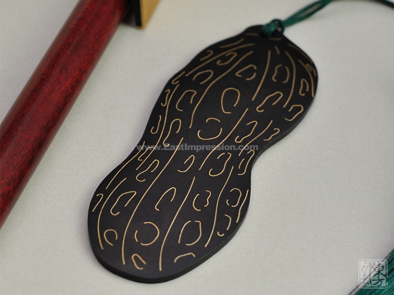以国标红木紫光檀为材质,仿真花生的外形与表面纹理,手工镶嵌66条长短不一的铜丝,经过15道打磨工序方可完成。搭配墨绿色流苏,选材精良,质感厚实。