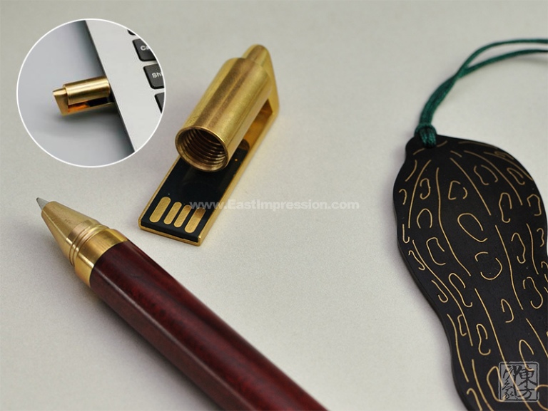 以科檀、黄铜为材质,笔夹内侧巧妙嵌入三星16G高速U盘,稳定性强,使用寿命比普通U盘更长。笔芯为德国施耐德笔芯(型号850),可替换多品牌同型号笔芯。
