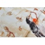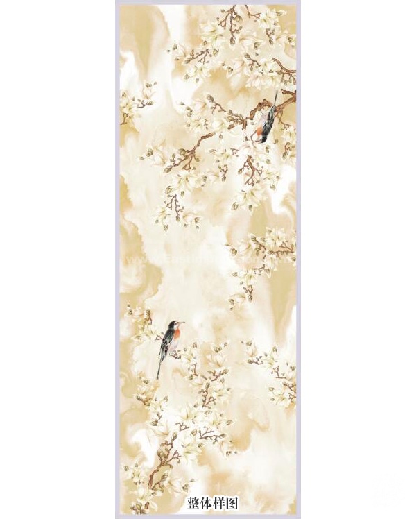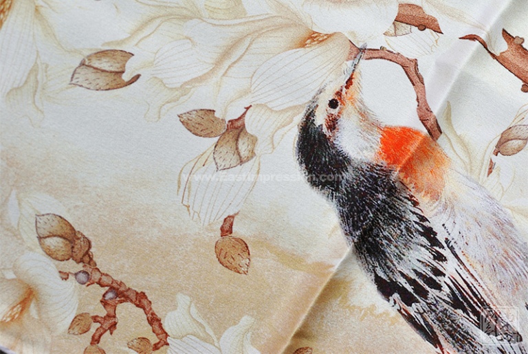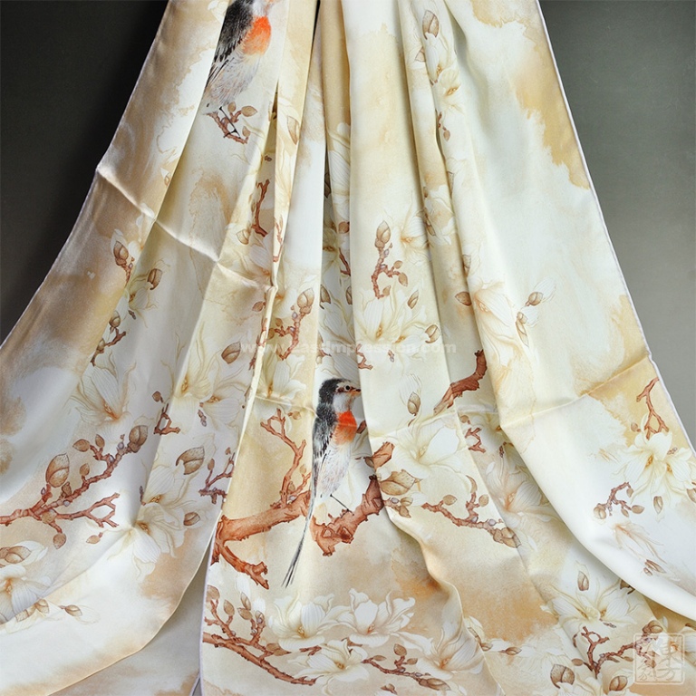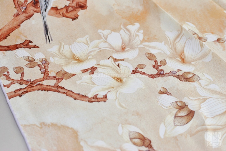 该丝巾以12姆米真丝素绉缎为面料,图案采用先进的数码喷印技术,密针手工卷边工艺精制而成。画面犹如一幅清丽脱俗的工笔花鸟画,大片的木兰花簇拥枝头竞相绽放,美丽的雀鸟好似自然的精灵在驻足欣赏早春的美景。