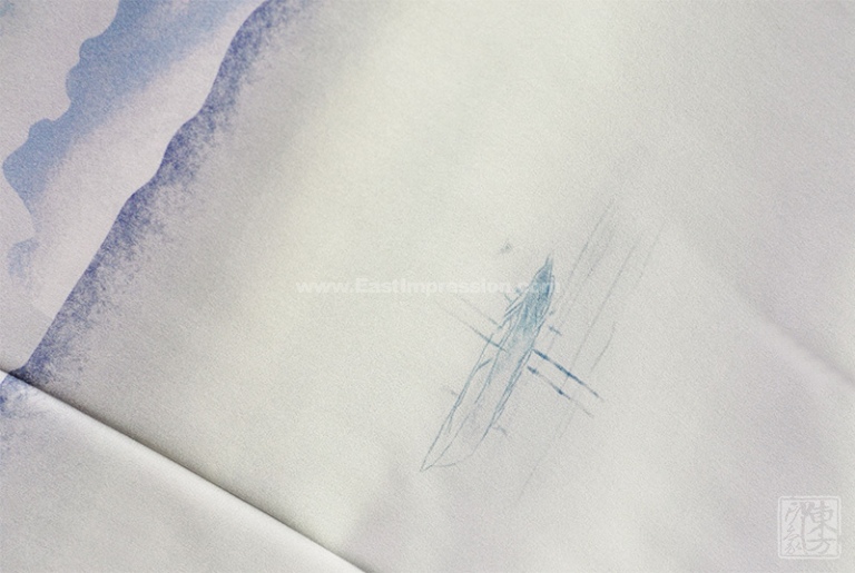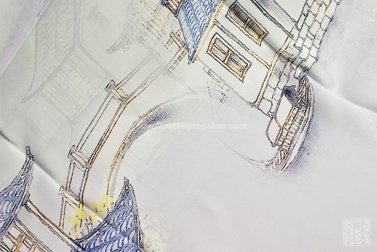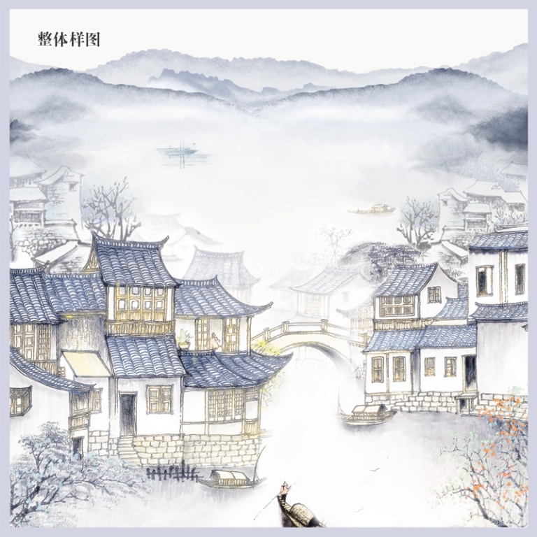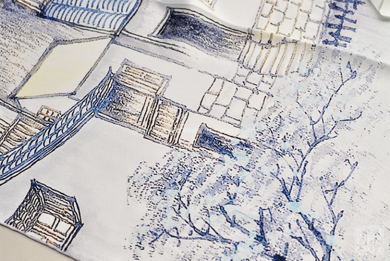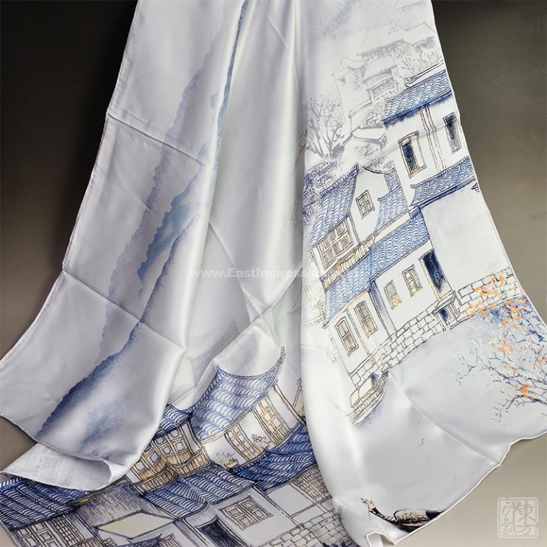 丝巾散发着珍珠般柔和的光泽,表面平整光洁,触感细腻丝滑。16姆米真丝素绉缎的筋骨性好,拥有自然垂坠感。丝巾图案表现的是晨雾中的江南水乡,远处的群山在烟波缥缈间若隐若现,近处白墙黛瓦的民居依河而立,小桥枕水若虹,晨起的乡民已撑船出行,江南水乡的诗情画意尽在其中。