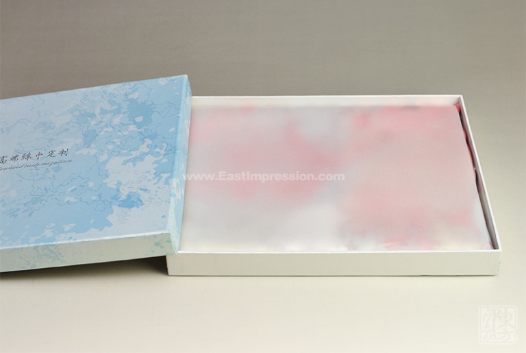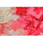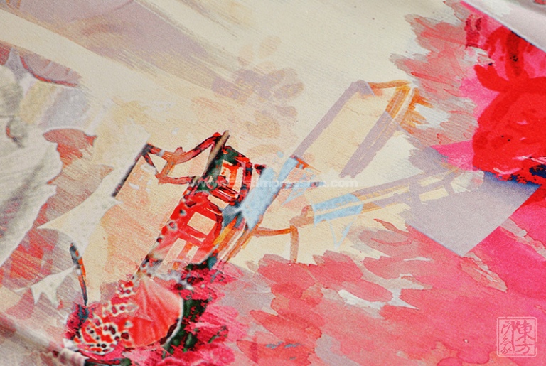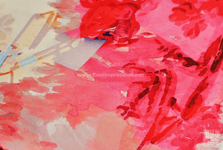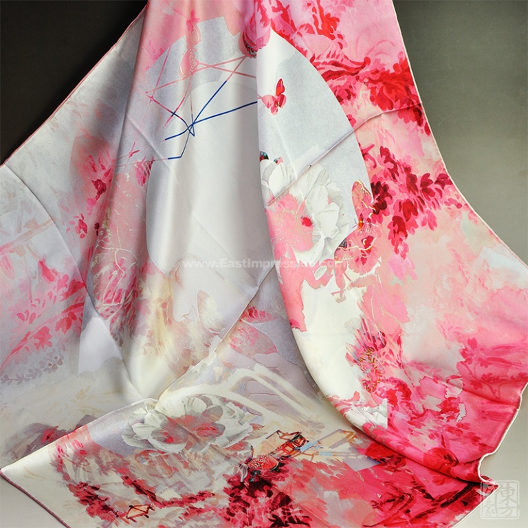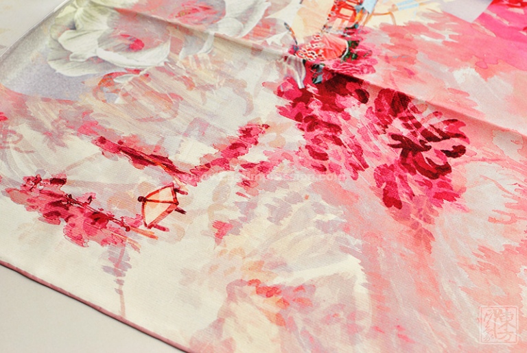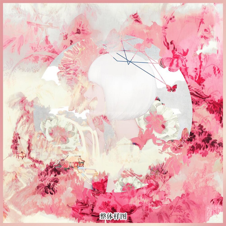 该丝巾以16姆米真丝素绉缎为面料,图案采用先进的数码喷印技术,密针手工卷边工艺精制而成。丝巾色调如粉面桃花娇艳可人,画面的设计如梦如幻,梦入桃花源代表了我们每个人心中对安宁和乐、自由平等生活的向往。