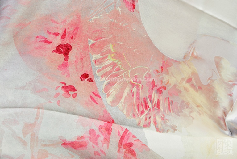 丝巾的图案采用先进的数码喷印技术,使丝巾的色彩更丰富饱满,花型层次过渡自然柔美。密针手工卷边工艺(每2厘米不低于5针),丝巾的对接缝更加美观,更为细腻精致。
