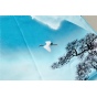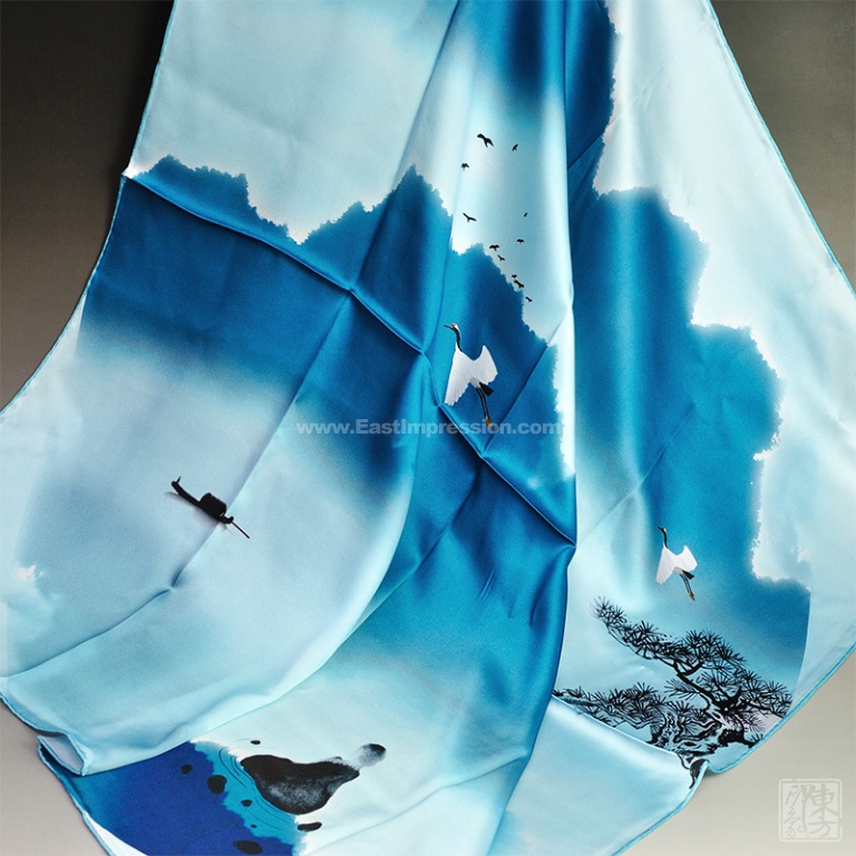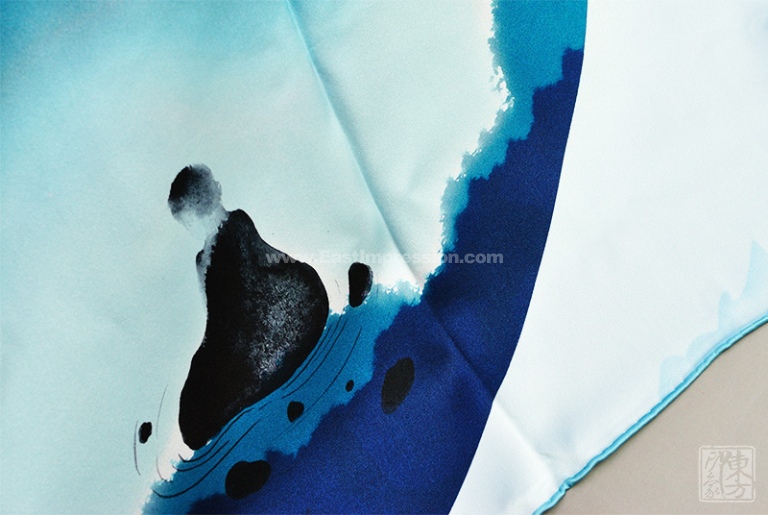 丝巾散发着珍珠般柔和的光泽,表面平整光洁,触感细腻丝滑。16姆米真丝素绉缎的筋骨性好,拥有自然垂坠感。丝巾图案是一幅充满禅意的水墨山水,群山连绵,云雾飘渺,一叶扁舟行于云水间,数只飞鸟凌空展翅,一位入定的小沙弥心无旁骛,任世间一切风起云涌,我心自安然。