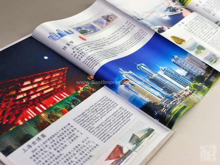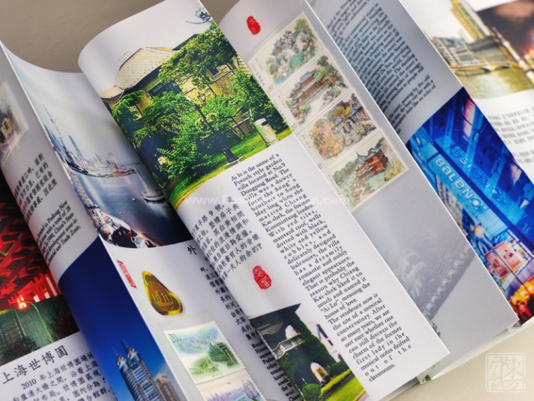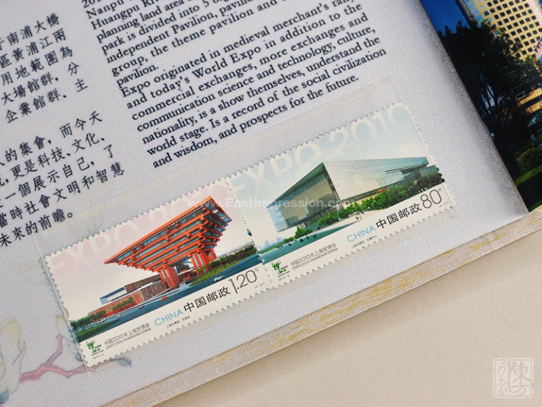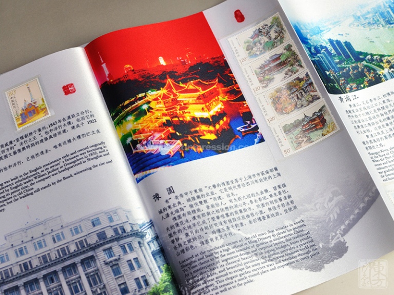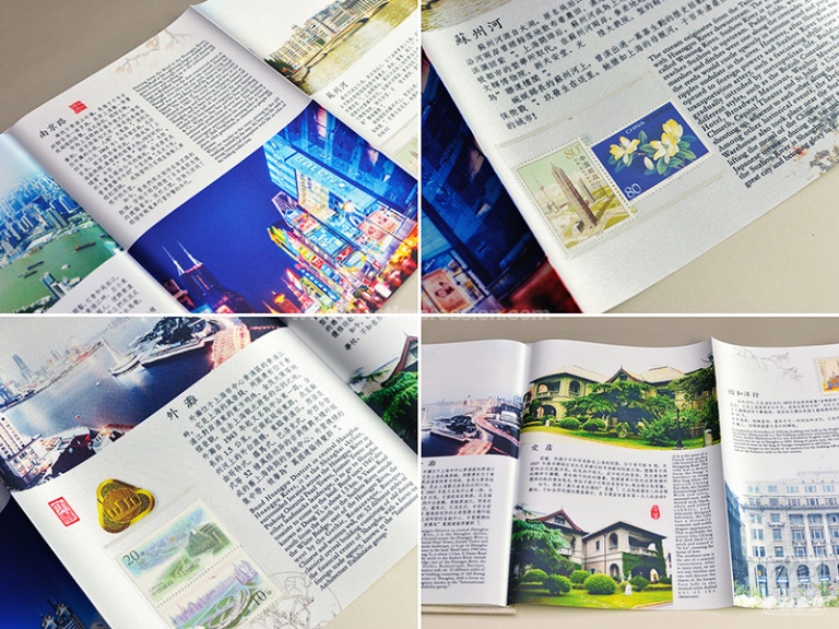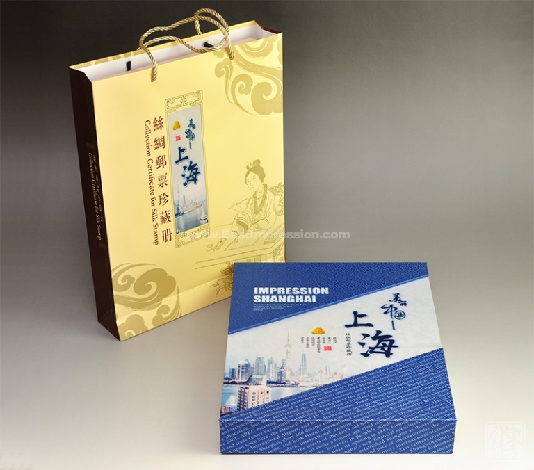 《印象上海》丝绸邮票珍藏册以杭州高档丝绸为载体,运用高分辨率丝绸彩印技术,表面经防水防霉防紫外线处理,易于经久保存。装帧设计仿古书籍精装册页设计,图文并茂,中英文对照,同时配以中国邮政发行的主题邮票15张。