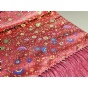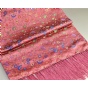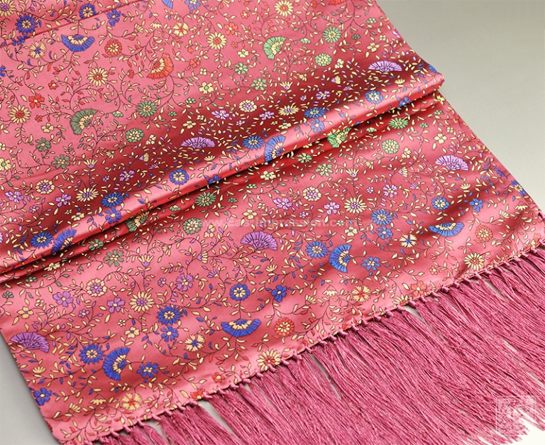 云锦是中国传统的华丽高贵的提花丝织工艺品,集历代织绵工艺艺术之大成,已入选《人类非物质文化遗产代表作名录》。其用料考究,织工精细,图案色彩典雅富丽,宛如天上的云彩般瑰丽。此款云锦披肩以桑蚕丝为经,多种色彩的丝线为纬,交织而成。橡皮粉的主体色调,柔和而优雅。各种精巧美丽的花卉纹样通体铺陈,绚丽夺目,体现了昔日皇家御用贡品雍容华贵的气度。