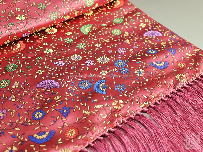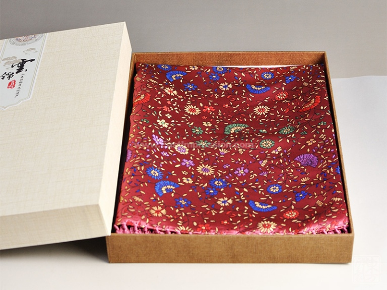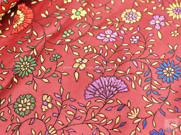 此款云锦披肩以蚕丝为经(20%桑蚕丝),金丝线、红丝线、绿丝线、蓝丝线、紫丝线为纬,经提花、织造工艺交织而成,质地坚实,手感平滑。繁花朵朵的花卉/枝叶图案大量使用金线,展现了云锦喜用金的显著特色,形成了绚丽夺目的独特视觉效果。