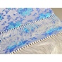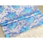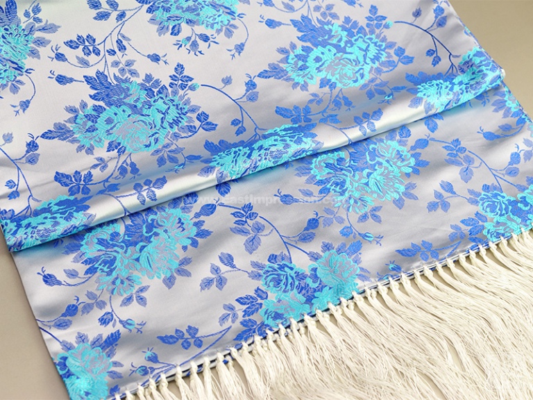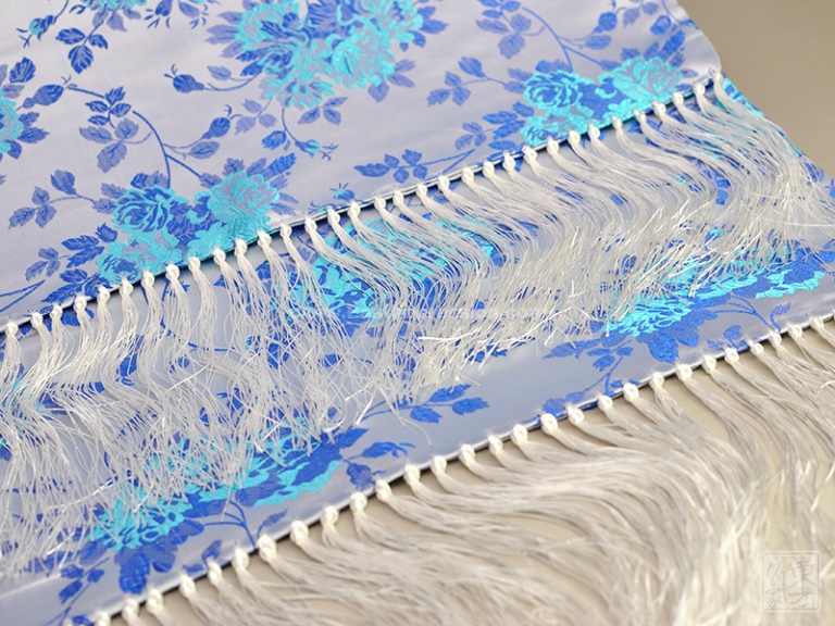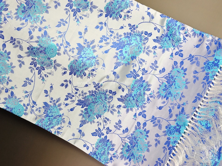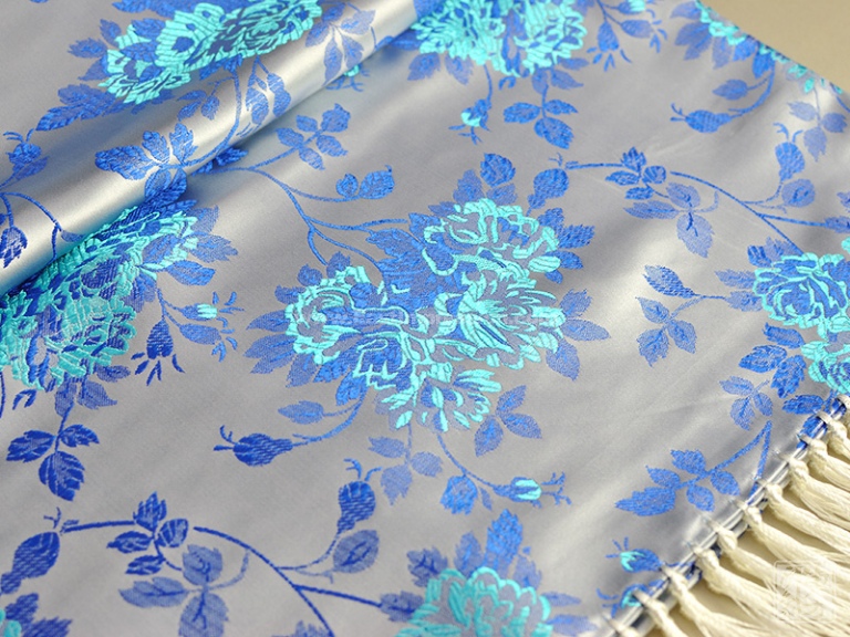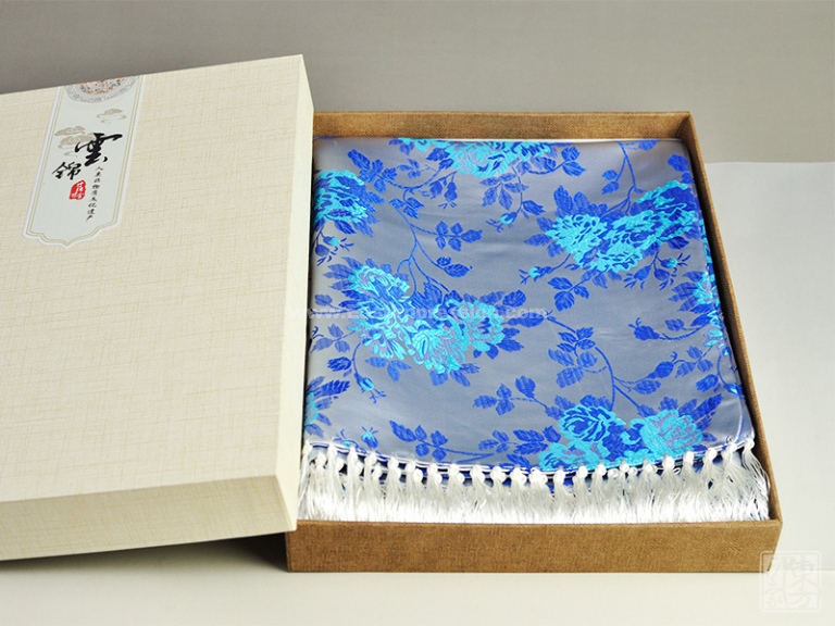 此款云锦披肩以蚕丝为经(20%桑蚕丝),宝蓝色、湖蓝色丝线为纬,经提花、织造工艺交织而成,在花叶的织造工艺上展现了明暗、虚实的特点,使得图案呈现出立体感。质地坚实,抚之手感平滑舒适。