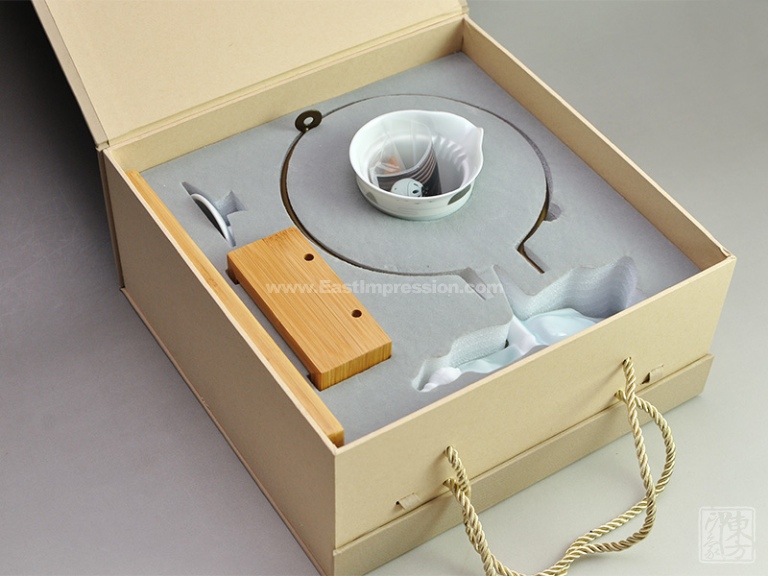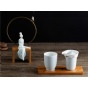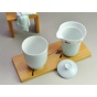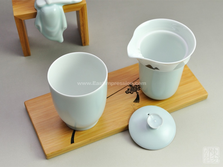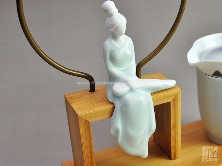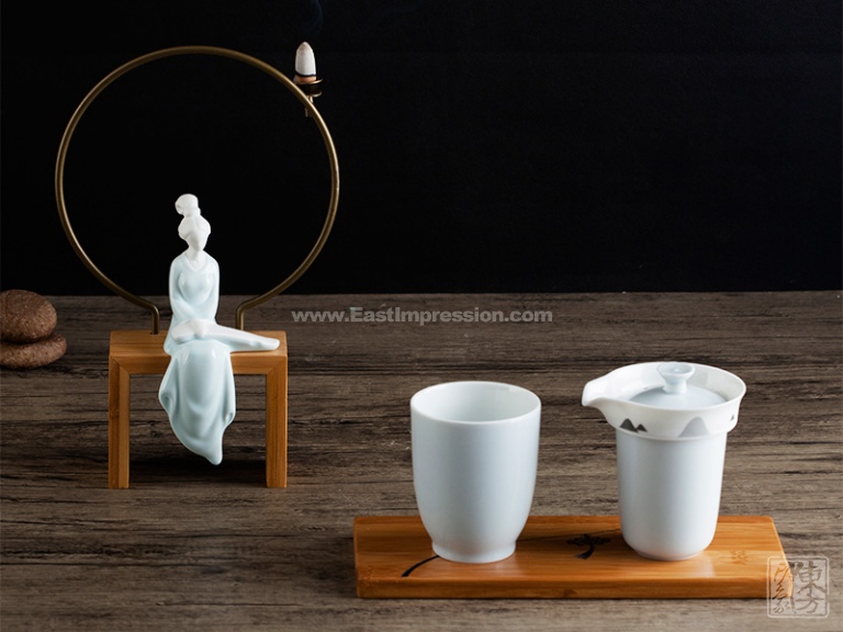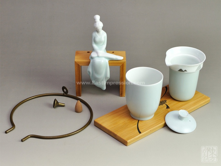 茶壶与茶杯是可分可组的快客杯结构,杯中有壶,合二为一。瓷体均为德化享誉盛名的玉脂瓷,亚光的青灰釉水清新淡雅。抚琴美人以德化白瓷为瓷体,头面、脖颈、古琴等部分素烧不施釉,其余则施粉青釉。竹托底座为老孟宗竹制成,搭配金属材质的圆形摆件与四粒倒流香(印度老山檀香)。