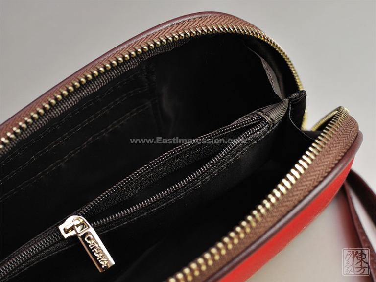 以5A级100%桑蚕丝为原料,正面面料为真丝素绉缎,里料为100%聚酯纤维,镶料为超纤,内设6个卡位、1个拉链袋、共计3层结构,配拎绳(可拿可拎),内部空间较为宽裕。