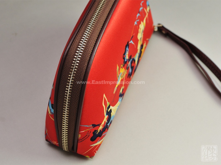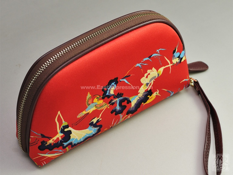 主题图案采用天然环保的活性染料及台版印花、生物酶后整理技术,使其颜色更加均匀鲜亮。手包运用纳米专利技术进行防水、防污、防油的三防处理,丝绸的华美质感和实用性能两者兼得。
