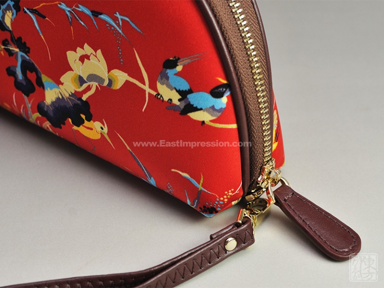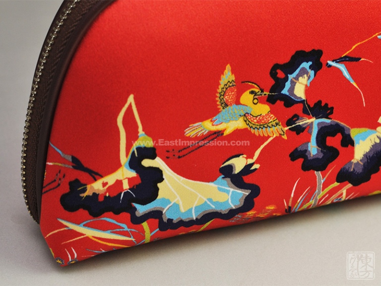 该款手包以5A级100%桑蚕丝为原料,采用台版印花、天然环保活性染料等优良工艺精制而成。以“一鹭莲升”为主题纹饰,融合明清四大名绣的传世蓝本,图案色彩丰富,情境欢欣美妙,寓意工作生活一路连升、和美顺达。橙红的主色调,演绎女性温暖而明朗的风采。