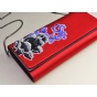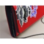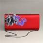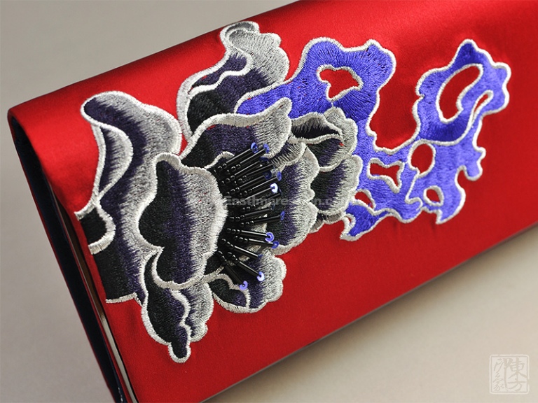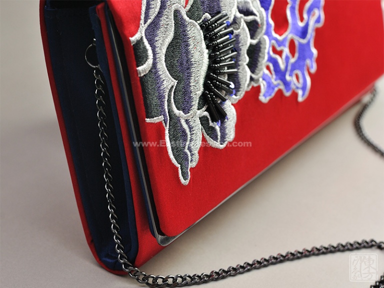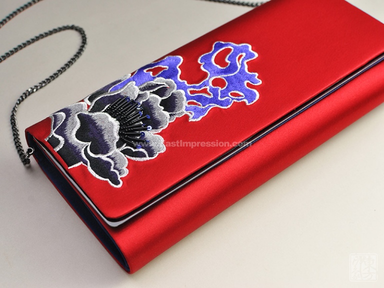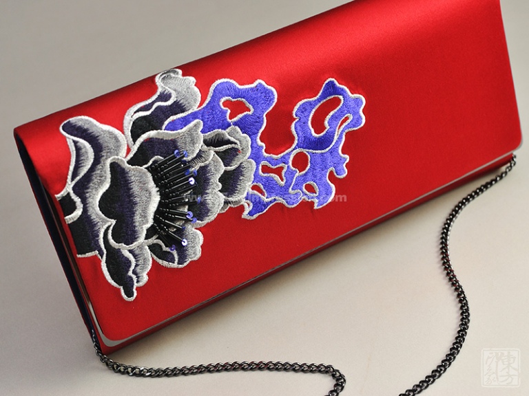 该款手包的主题图案为大面积刺绣“芳园牡丹”,牡丹花头如歌若舞,富有情态与动势,刺绣牡丹以黛黑、深紫、深灰、蓝紫层层演绎,再以亮银色镶边,统一中富有韵律和层次之美。手工钉珠犹如花蕊,晶莹亮泽。整款手包闪耀着真丝纤维柔和华贵的光泽,酒红的主色调配以精湛的刺绣牡丹,将其成熟优雅的格调淋淋尽致地展现。