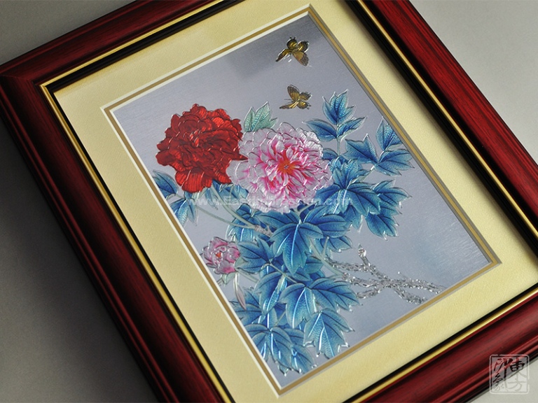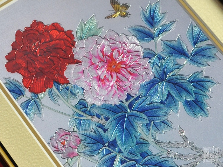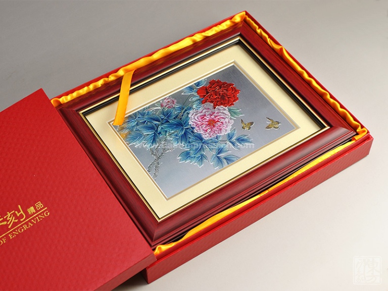 纯手工铝板彩雕工艺画的艺术手法独特,牡丹花朵、枝叶、彩蝶的纹理线条在强光下清晰可见,纹理疏密一致。纯手工雕刻工艺做工精细,质感细腻,将花瓣与枝叶的轮廓勾勒地错落有致,将花朵的开合与叶脉的纹理等细节展现地淋漓尽致,极富立体感。每个局部细节都经过成千上万次的“千刀万刮”,牡丹花色彩绚丽,形象逼真,具有华贵典雅的艺术气息。