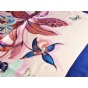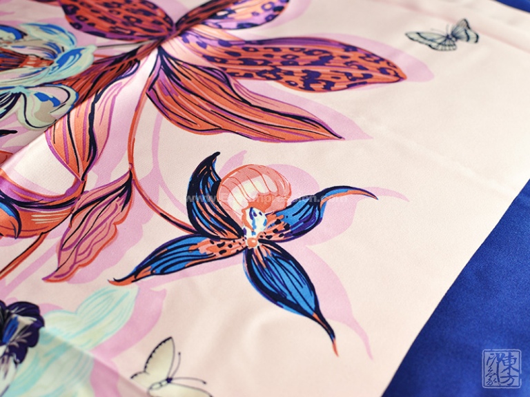 以5A级100%桑蚕丝为原料,面料为真丝素绉缎。主题图案“锦绣年华”采用天然环保的活性染料及台版印花、生物酶后整理技术,使其颜色更加均匀鲜亮。纯手工密针卷边,细节处见精致。