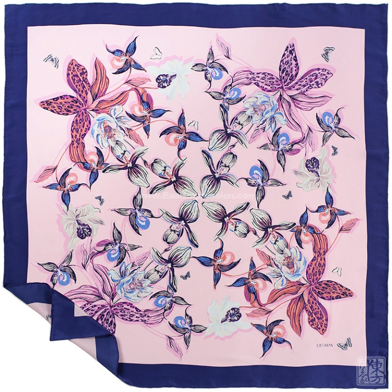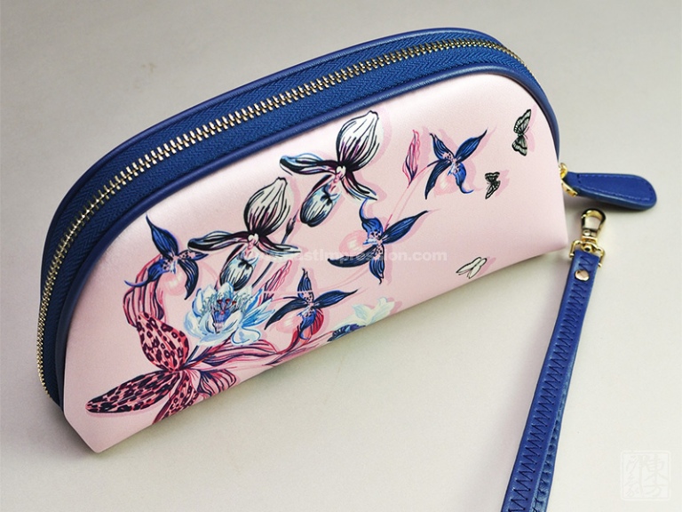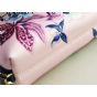 丝巾和手包的色彩互为映衬,以唯美浪漫的樱花粉为底色,主题图案采用奇幻的配色,独特的色彩组合增强了视觉的张力。从虎皮兰、蝴蝶花到其他小花如夕颜,所有花朵都崭露头角,引得蝴蝶翩然而至。以手绘的笔触及粗细条的处理方式体现了随性的风格。婉转流动的枝蔓和卷须也是塑造雅致、柔美格调的关键。