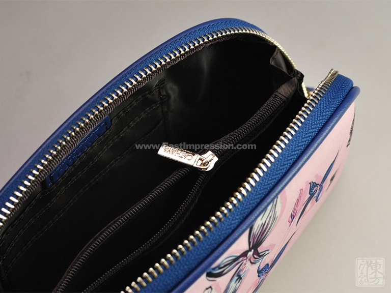 以5A级100%桑蚕丝为原料,正面面料为真丝素绉缎,里料为100%聚酯纤维,镶料为超纤,内设6个卡位、1个拉链袋、共计3层结构,配拎绳(可拿可拎),内部空间较为宽裕。
