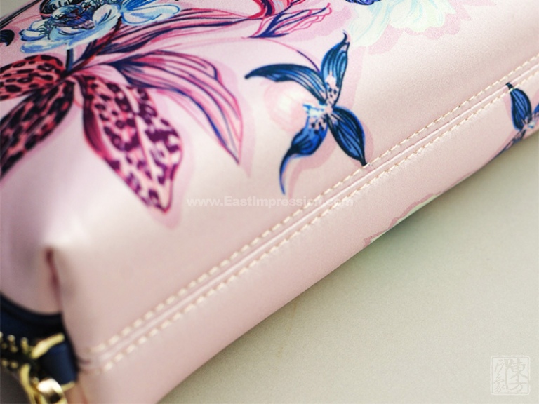主题图案“锦绣年华”采用天然环保的活性染料及台版印花、生物酶后整理技术,使其颜色更加均匀鲜亮。手包运用纳米专利技术进行防水、防污、防油的三防处理,丝绸的华美质感和实用性能两者兼得。