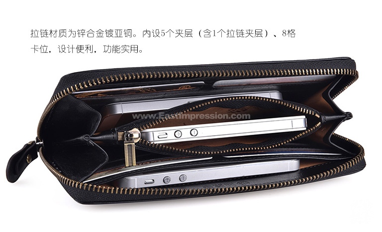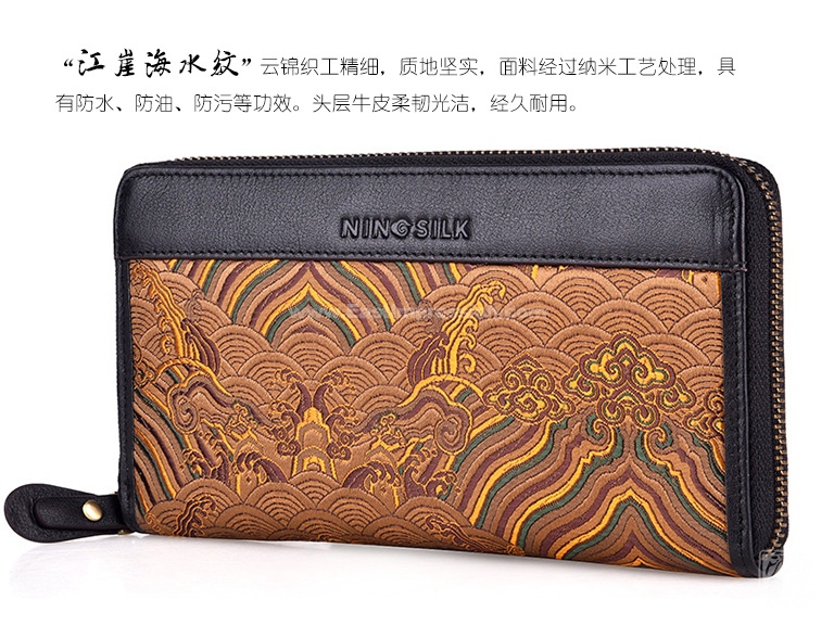 该款钱包以50%桑蚕丝云锦拼接100%头层牛皮为主材质。“江崖海水纹”云锦织工精细,质地坚实,面料经过纳米工艺处理,具有防水、防油、防污等功效。头层牛皮柔韧光洁,经久耐用。拉链材质为锌合金镀亚铜。内设5个夹层(含1个拉链夹层)、8格卡位,可归置纸币、硬币,还可放入手机、车钥匙之类的随身物品,拉链设计简单便利,实用功能超强。
