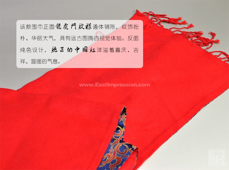该款围巾在色调上正反红色有呼应,表现风格上迥然不同。正面龙虎斗的纹样通体铺陈,纹饰天然拙朴、华丽大气,具有远古图腾的视觉体验。织工精致细腻,彰显雍容华贵的气派。反面纯色设计,纯正的中国红洋溢着喜庆、吉祥、温暖的气息,佩戴起来柔软舒适、保暖宜人。