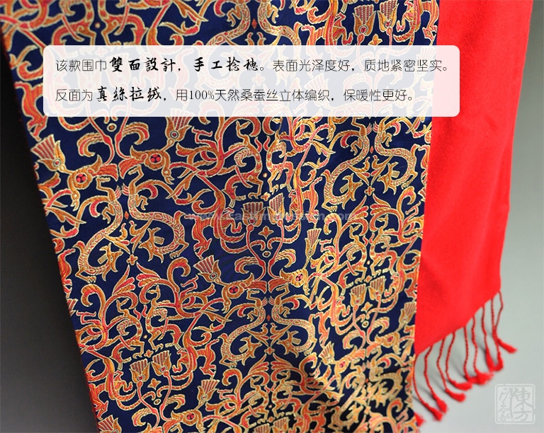 该款围巾双面设计,手工捻穗。正面以蚕丝为经(50%桑蚕丝),酒红色、古铜色、淡黄色丝线为纬,经提花、织造工艺交织而成。表面光泽度好,质地紧密坚实,手感柔软。反面为真丝拉绒,用100%天然桑蚕丝立体编织,保暖性更好。拉绒是指对真丝面料做物理性处理(超细起绒加工技术),使它更亲肤更舒适,不会像羊绒、羊毛质地围巾有扎脖子的问题。物理拉绒提升了蚕丝的保暖效果,同时具有很好的延展性和弹性。