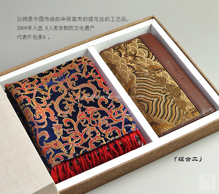 云锦围巾钱包套装:云锦真丝拉绒围巾(富贵连理)+云锦真皮钱包
