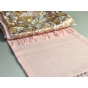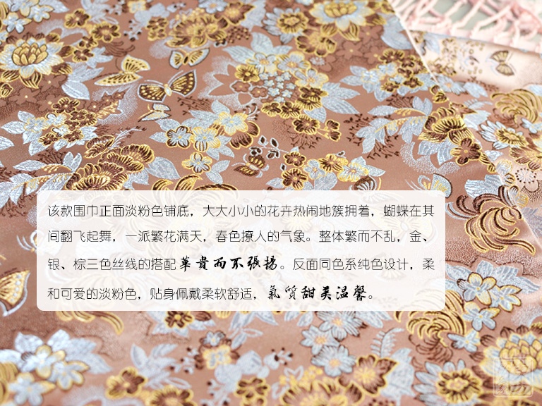 该款围巾正面淡粉色铺底,花卉、蝴蝶纹样通体铺陈,形态各异、大大小小的花卉热闹地簇拥着,蝴蝶在其间翻飞起舞,一派繁花满天,春色撩人的气象。整体繁而不乱,金、银、棕三色丝线的搭配华贵而不张扬。反面同色系纯色设计,柔和可爱的淡粉色,贴身佩戴柔软舒适,气质甜美温馨。