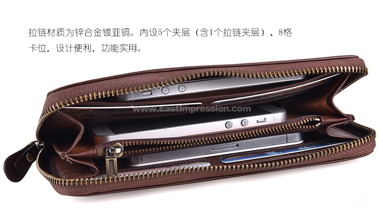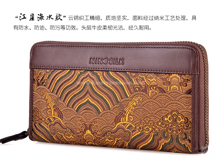该款钱包以50%桑蚕丝云锦拼接100%头层牛皮为主材质。“江崖海水纹”云锦织工精细,质地坚实,面料经过纳米工艺处理,具有防水、防油、防污等功效。头层牛皮柔韧光洁,经久耐用。拉链材质为锌合金镀亚铜。内设5个夹层(含1个拉链夹层)、8格卡位,可归置纸币、硬币,还可放入手机、车钥匙之类的随身物品,拉链设计简单便利,实用功能超强。
