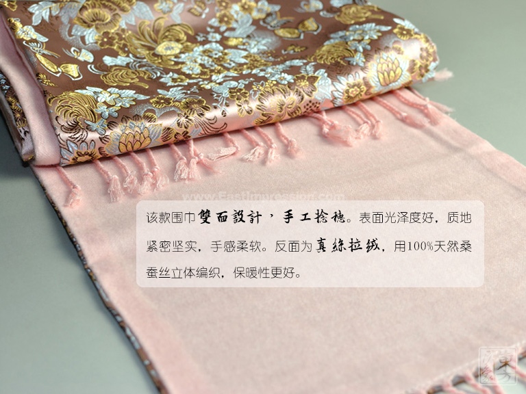 该款围巾双面设计,手工捻穗。正面以蚕丝为经(50%桑蚕丝),金色、银色、棕色丝线为纬,经提花、织造工艺交织而成。表面光泽度好,质地紧密坚实,手感柔软。反面为真丝拉绒,用100%天然桑蚕丝立体编织,保暖性更好。拉绒是指对真丝面料做物理性处理(超细起绒加工技术),使它更亲肤更舒适,不会像羊绒、羊毛质地围巾有扎脖子的问题。物理拉绒提升了蚕丝的保暖效果,同时具有很好的延展性和弹性。