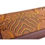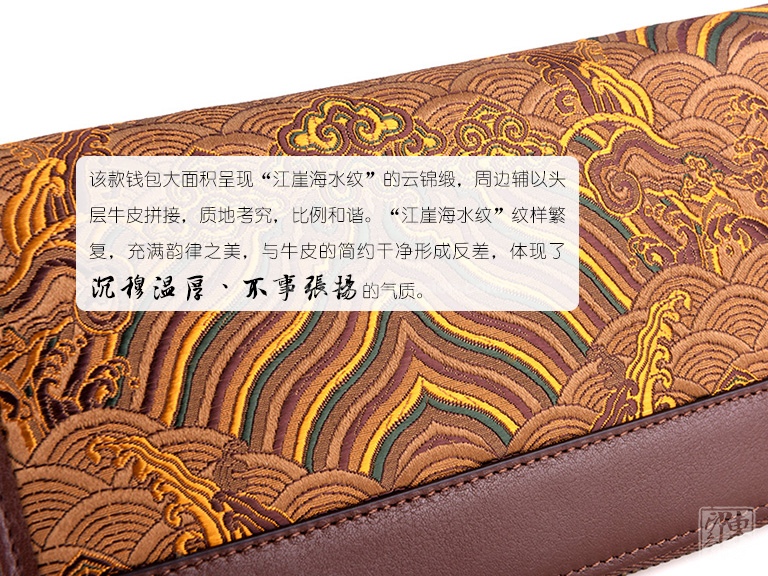 该款钱包大面积呈现“江崖海水纹”的云锦缎,周边辅以头层牛皮拼接,质地考究,比例和谐。“江崖海水纹”以咖啡色、浅棕色和墨绿色精织而成,纹样繁复,充满韵律之美,与同色系咖啡色牛皮的简约干净和谐统一,体现了沉穆温厚、不事张扬的气质。
