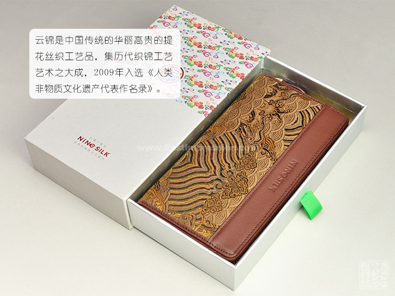该款钱包以50%桑蚕丝云锦拼接100%头层牛皮为主材质。“江崖海水纹”云锦织工精细,质地坚实,面料经过纳米工艺处理,具有防水、防油、防污等功效。头层牛皮柔韧光洁,经久耐用。拉链材质为锌合金镀亚铜。内设5个夹层(含1个拉链夹层)、8格卡位,可归置纸币、硬币,还可放入手机、车钥匙之类的随身物品,拉链设计简单便利,实用功能超强。