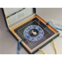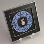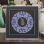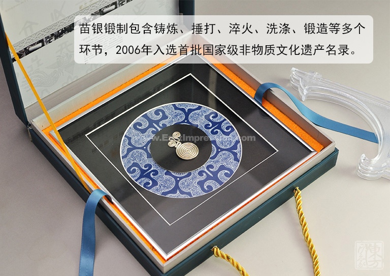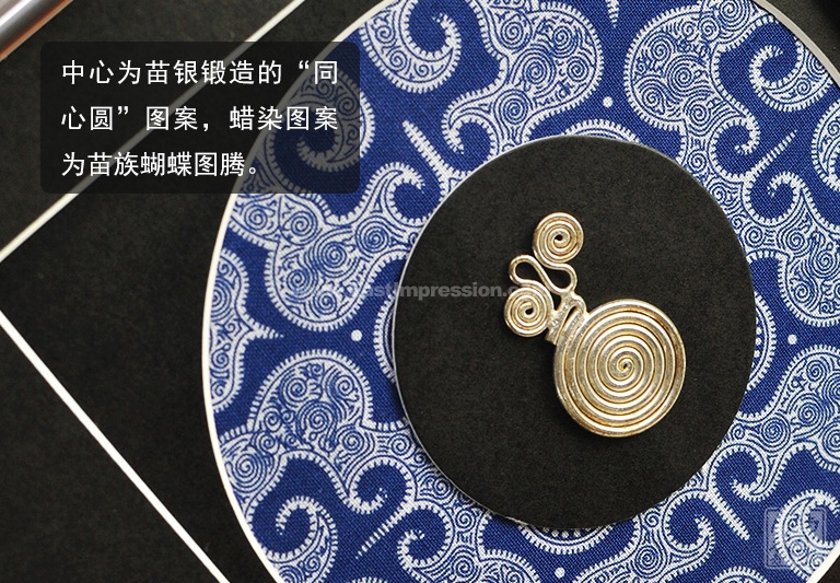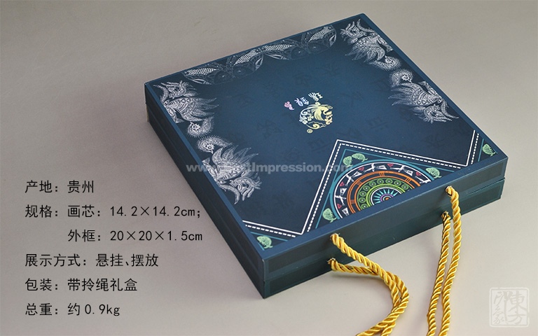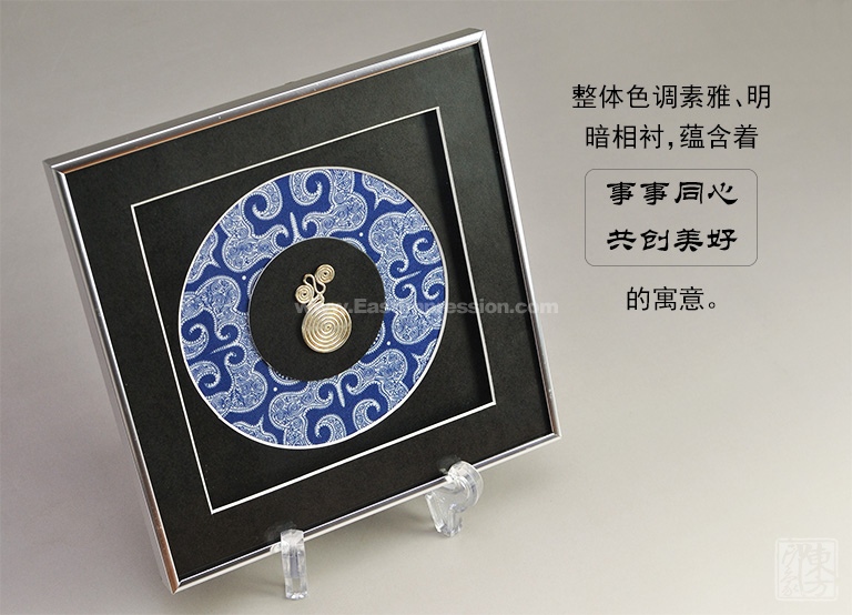 该款方框画融贵州民间艺术“蜡染”与“苗银”锻造工艺于一体,以“同心圆”为创意核心,蜡染图案为苗族蝴蝶图腾,蓝白色调素雅质朴,纹样繁复优美;中心为苗银锻造的同心圆图案,整体配色庄重、明暗相衬,蕴含着事事同心、共创美好的寓意。