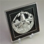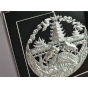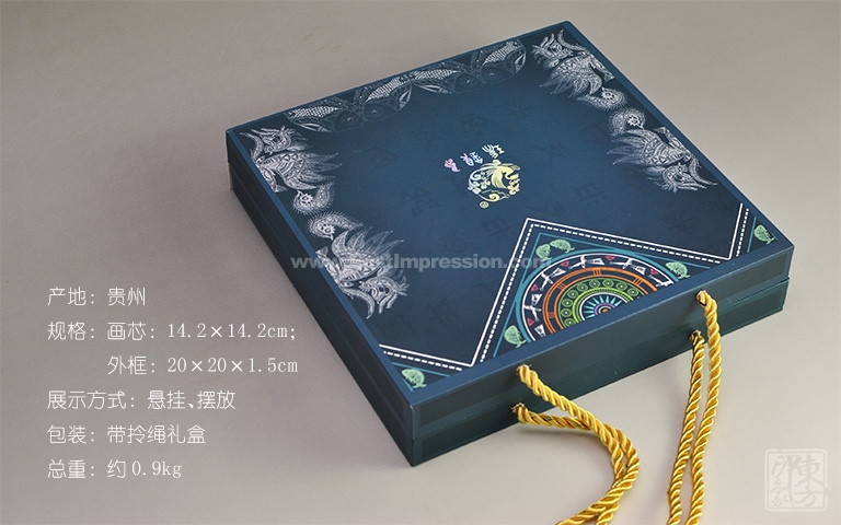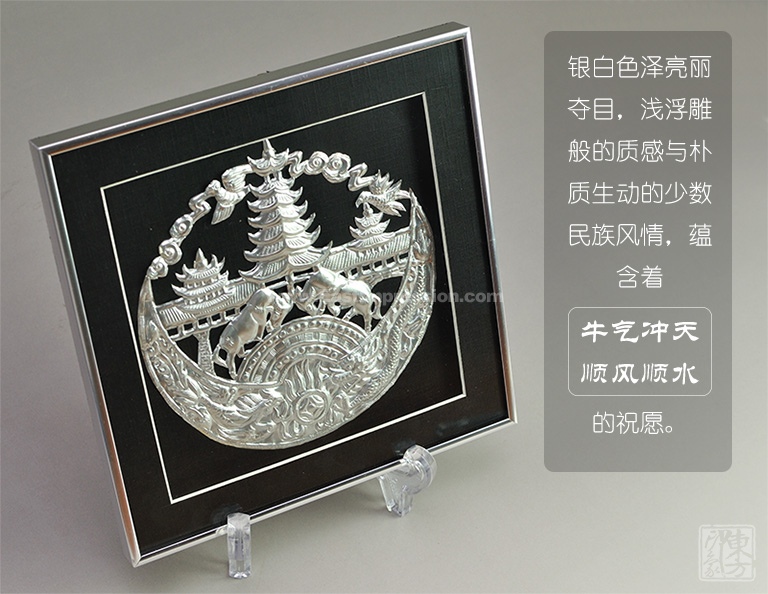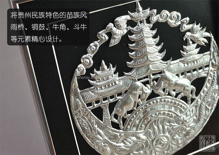 该款方框画以纯银片为材质,采用纯手工的银饰錾刻工艺,将贵州具有民族特色的苗族风雨桥、铜鼓、牛角、斗牛等元素精心设计,银白色泽亮丽夺目,錾刻技艺细腻精美,具有浅浮雕般的质感与朴质生动的少数民族风情,蕴含着牛气冲天、顺风顺水的祝愿。