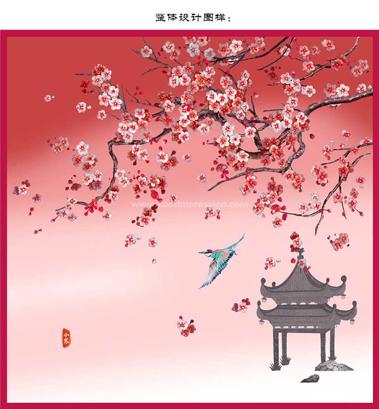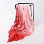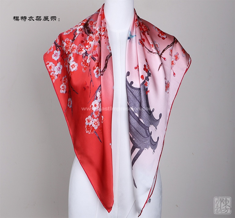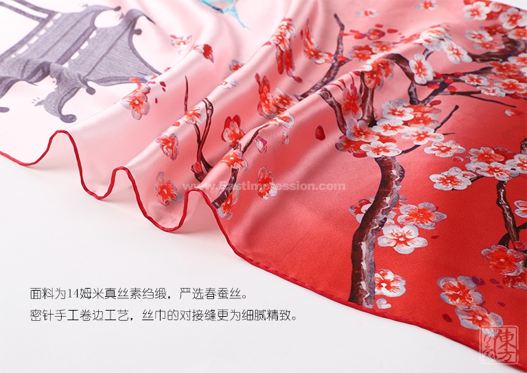 丝巾图案采用先进的数码喷印技术,使丝巾的色彩更丰富饱满,花型层次过渡自然柔美。密针手工卷边工艺,丝巾的对接缝更加美观,更为细腻精致。