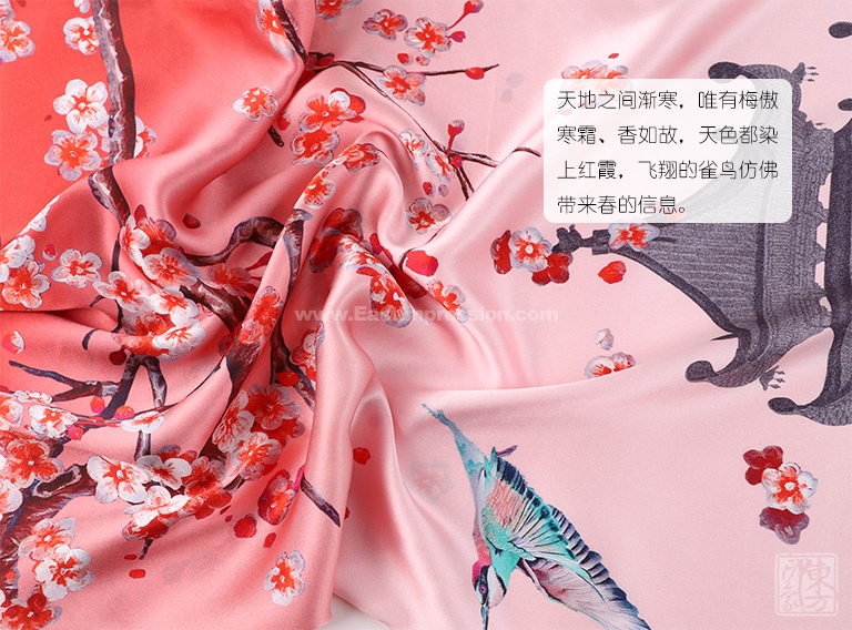 丝巾面料为14姆米真丝素绉缎。严选春蚕丝,春季万物复苏,蚕宝宝吐出的丝质更坚韧、有光泽,平滑细腻不可多得。