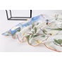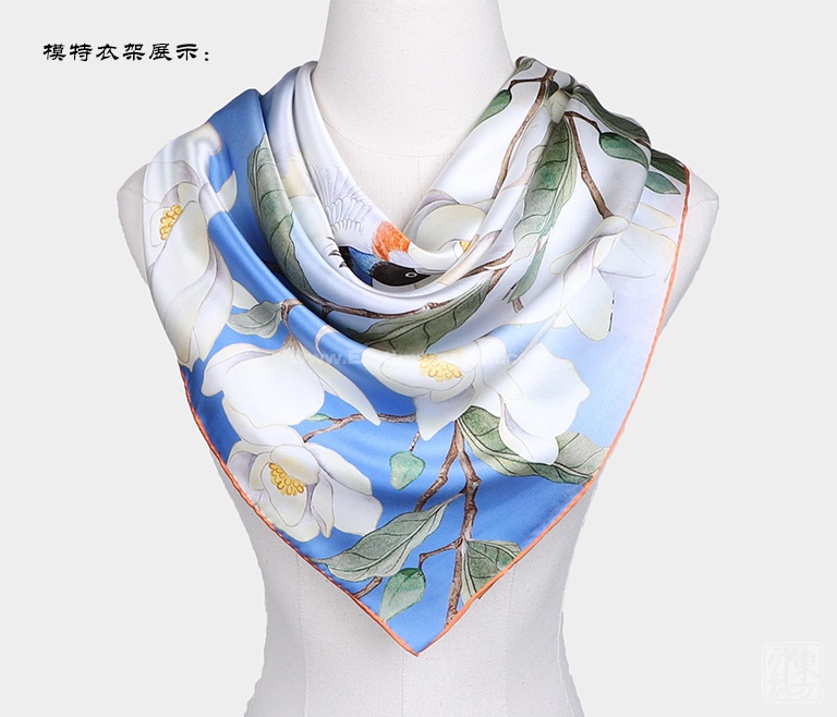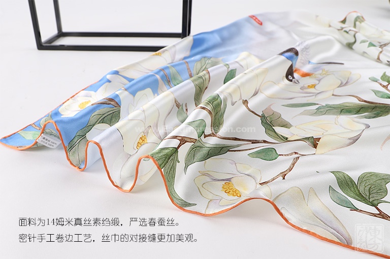 丝巾图案采用先进的数码喷印技术,使丝巾的色彩更丰富饱满,花型层次过渡自然柔美。密针手工卷边工艺,丝巾的对接缝更加美观,更为细腻精致。