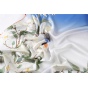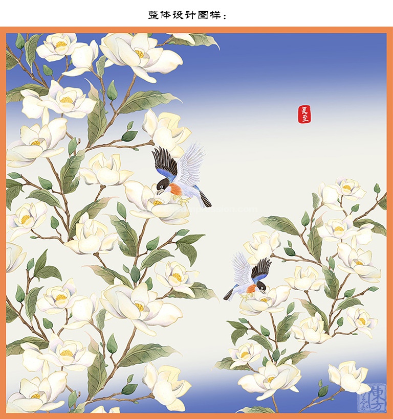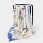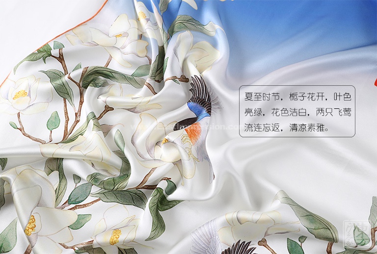 “孤姿妍外净,幽馥暑中寒。”该丝巾以14姆米真丝素绉缎为面料,图案采用先进的数码喷印技术,密针手工卷边工艺精制而成。画面撷取夏至时节栀子花开的情景,绿叶白花,清丽素雅,芳香四溢引得飞莺驻足流连,一派清新明丽的格调。