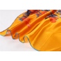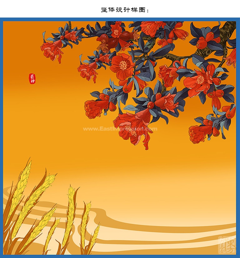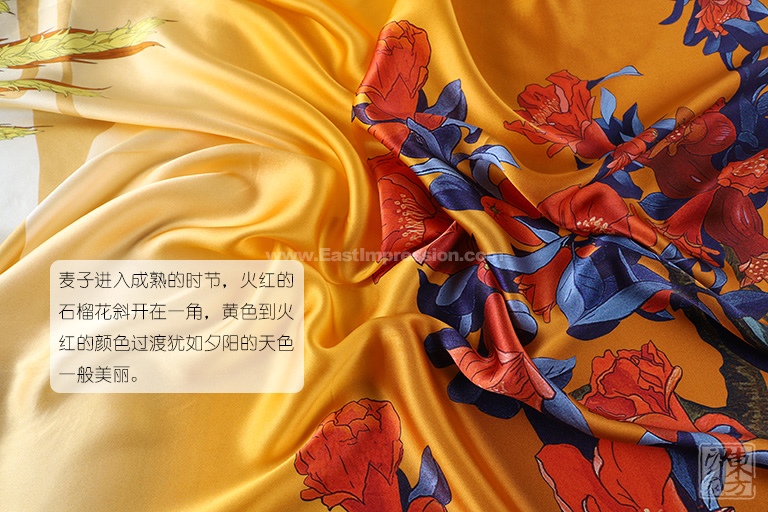 “及时趁芒种,散著畦东西。”芒种时节雨量充沛,是农忙之时,北方的麦子进入成熟的时节,火红的石榴花斜开在一角,与另一角的麦穗遥相呼应。设计师运用这种斜线构图的方式增加了整条丝巾的动感,让画面不再平淡,而黄色到火红的颜色过渡犹如夕阳的天色一般美丽。