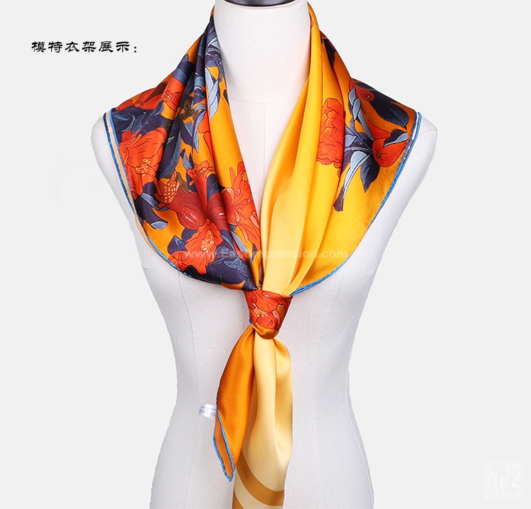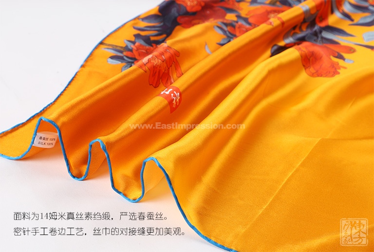 丝巾图案采用先进的数码喷印技术,使丝巾的色彩更丰富饱满,花型层次过渡自然柔美。密针手工卷边工艺,丝巾的对接缝更加美观,更为细腻精致。