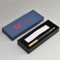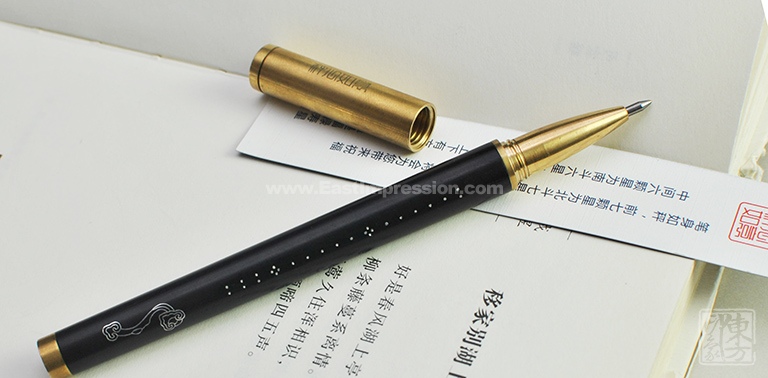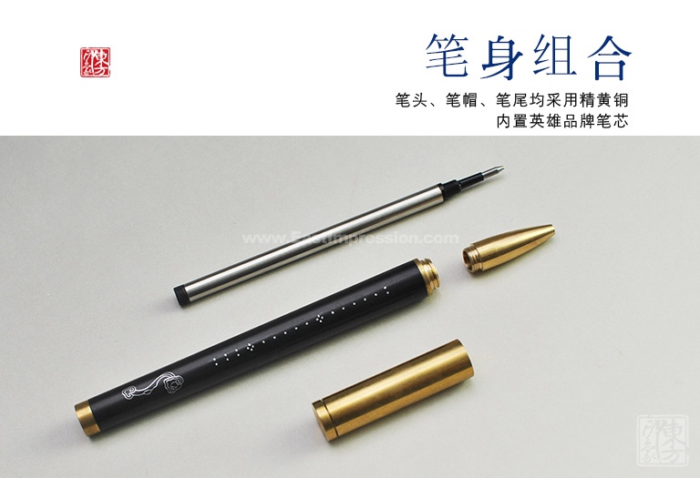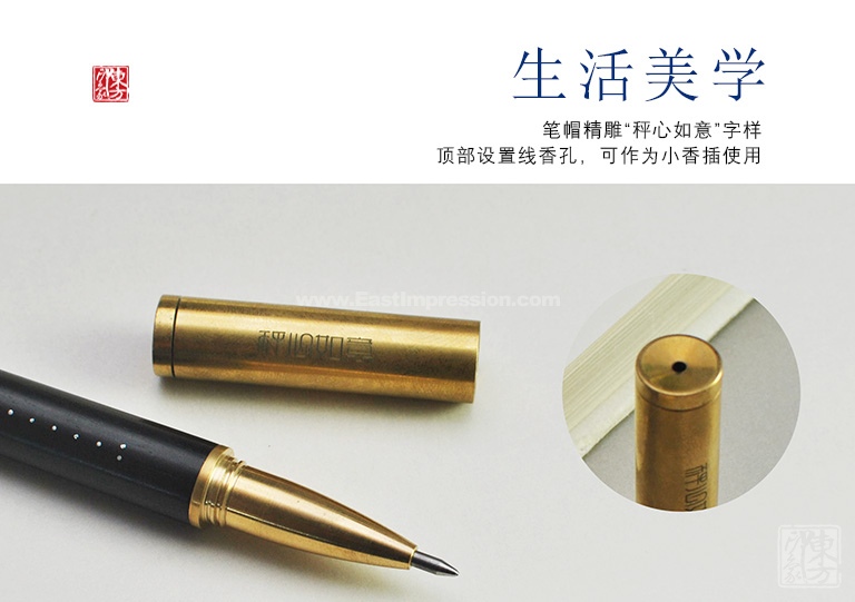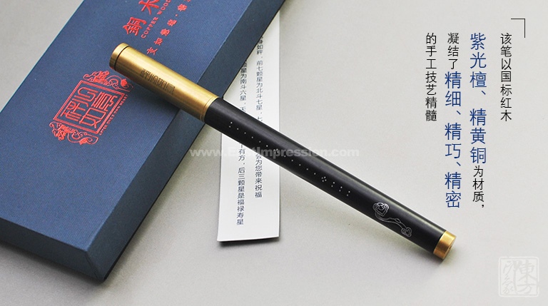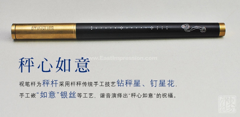 以国标红木紫光檀为笔杆材质,视笔杆为秤杆,采用杆秤的传统手工技艺钻秤星、钉星花,手工嵌“如意”银丝,再经打磨、抛光,凝结了精细、精巧、精密的手工技艺精髓,笔帽精雕“秤心如意”字样。笔头、笔帽、笔尾均采用精黄铜,内置英雄品牌笔芯。笔帽顶部设置线香孔,可作为小香插使用。