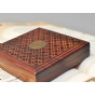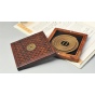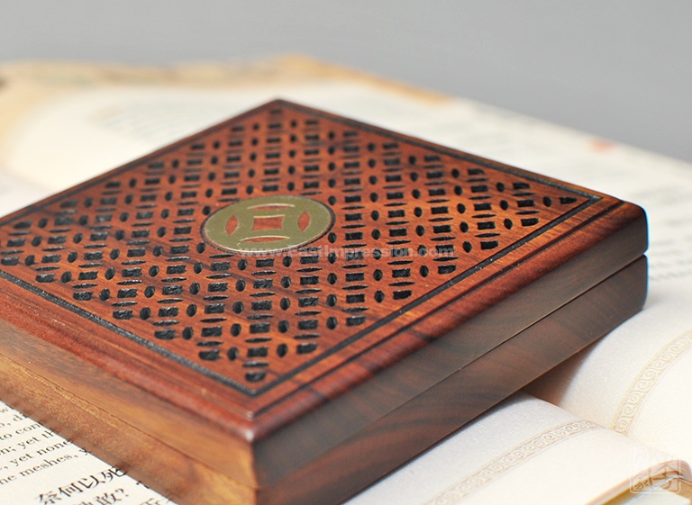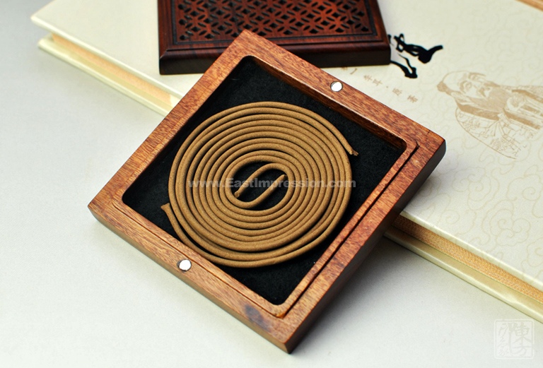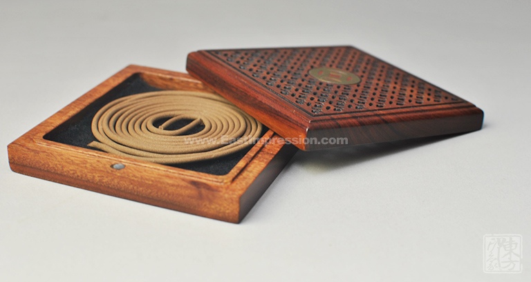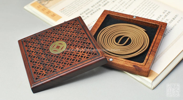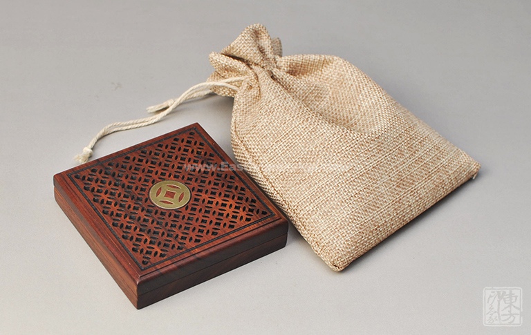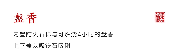 该盘香盒以非洲酸枝为材质,上盖镂空雕刻铜钱纹样,中心位置黄铜镶嵌铜钱纹样,内置防火石棉与可燃烧4小时的盘香,上下盖以吸铁石吸附。